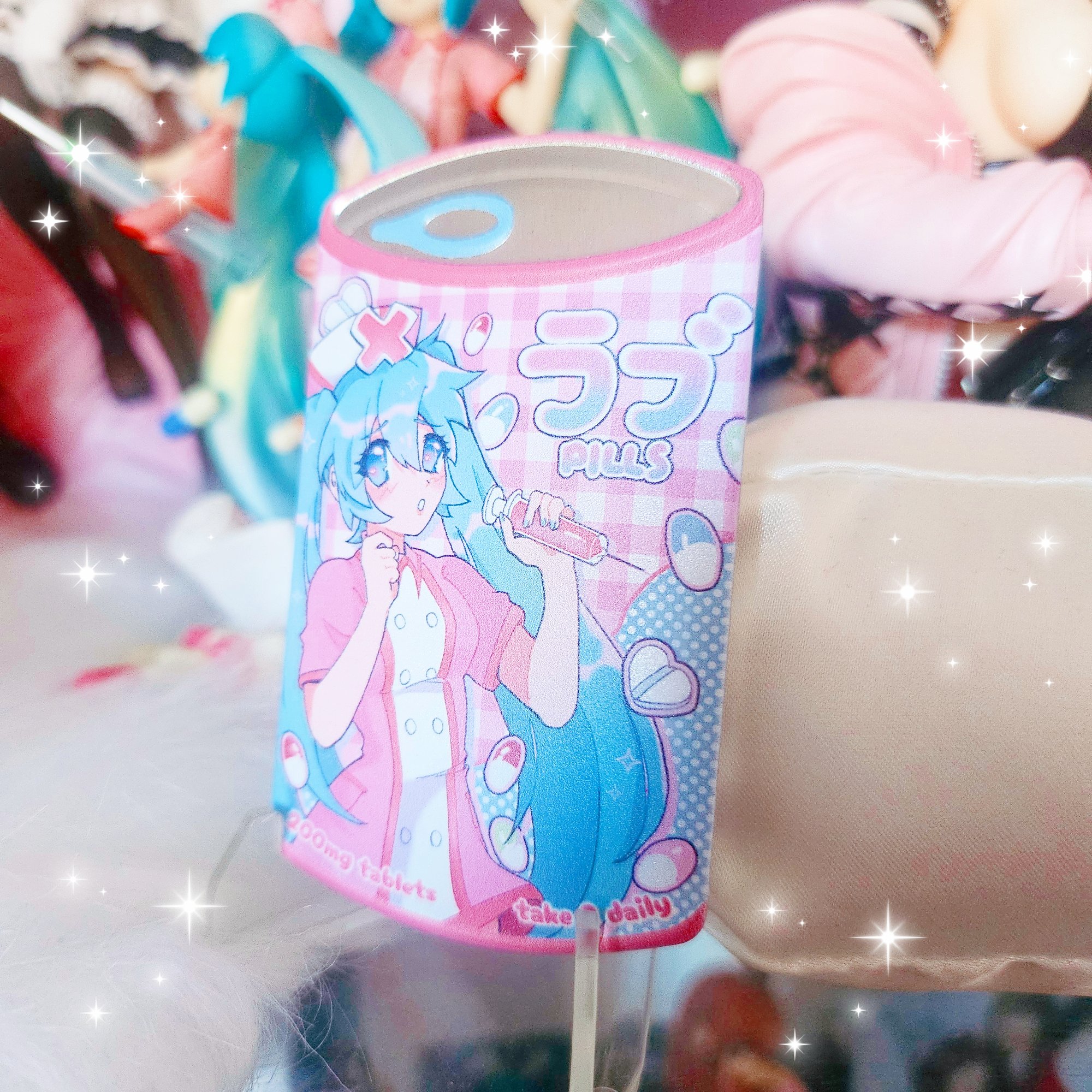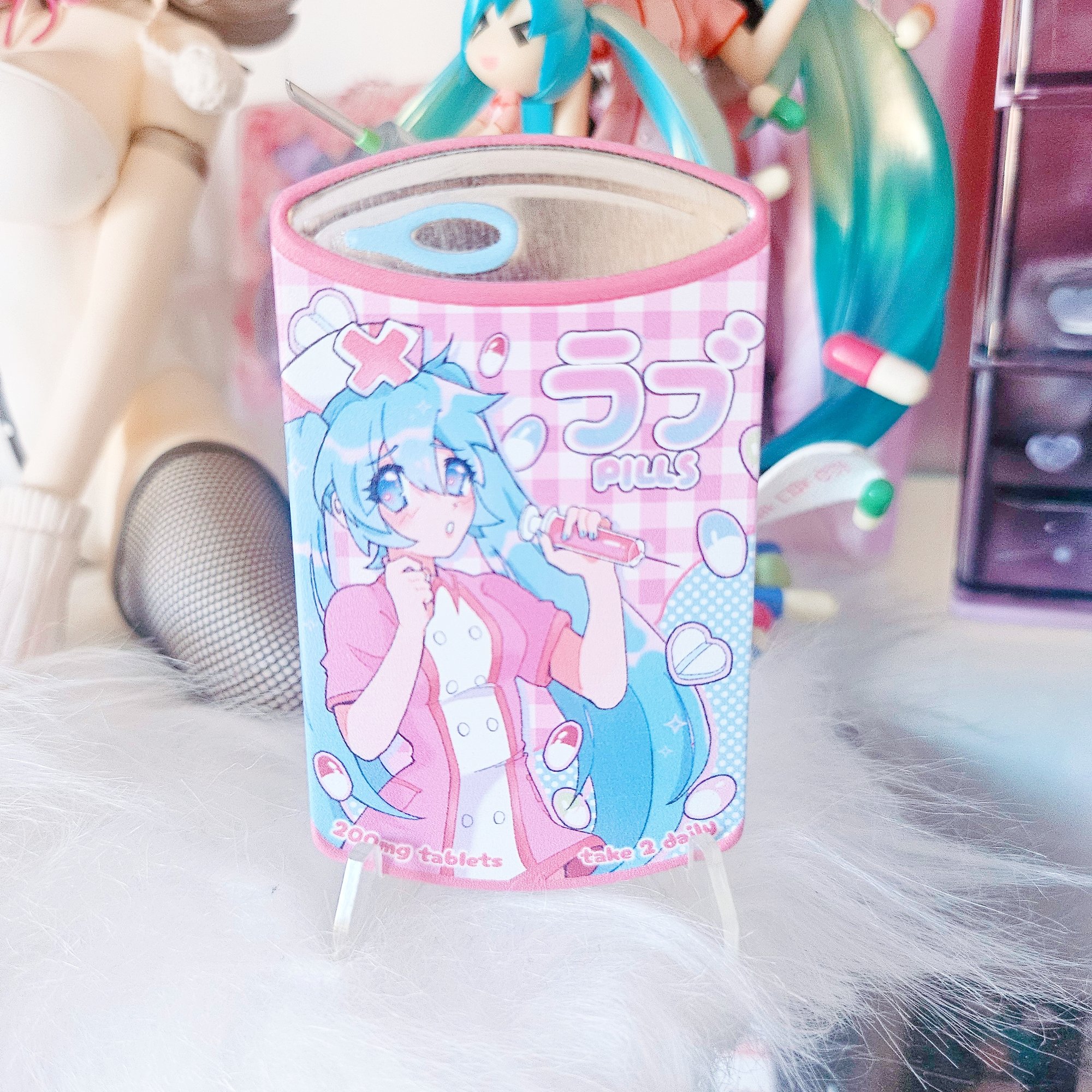 Can shaped badge featuring Hatsune Miku inspired by the song Love Coloured Ward.