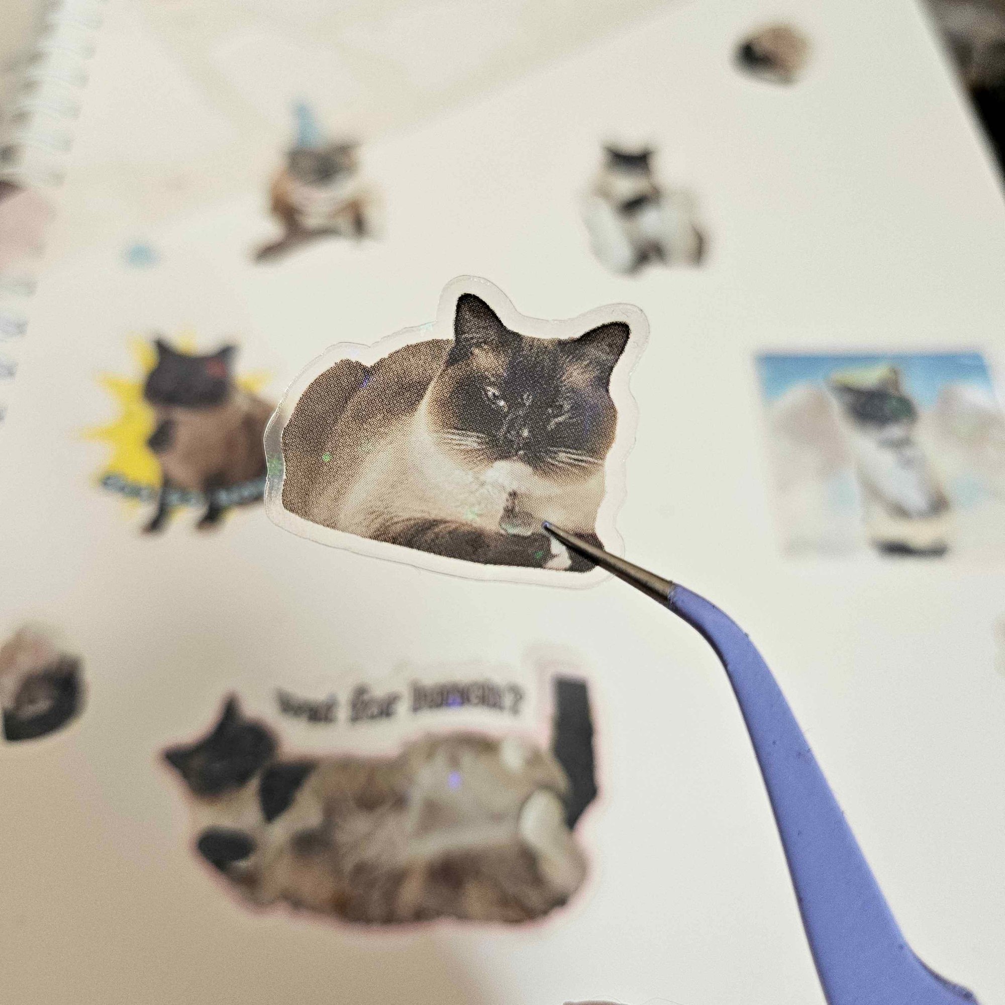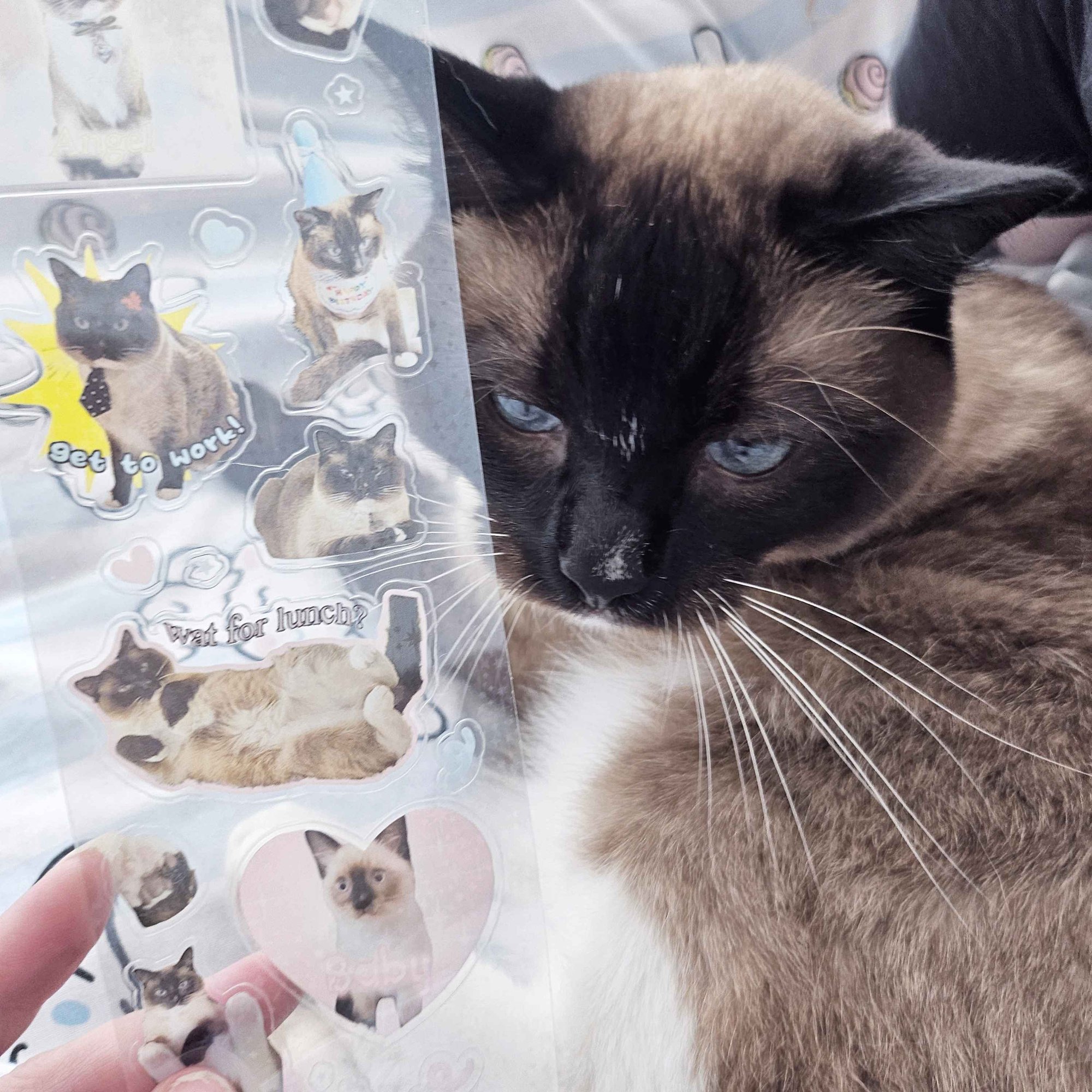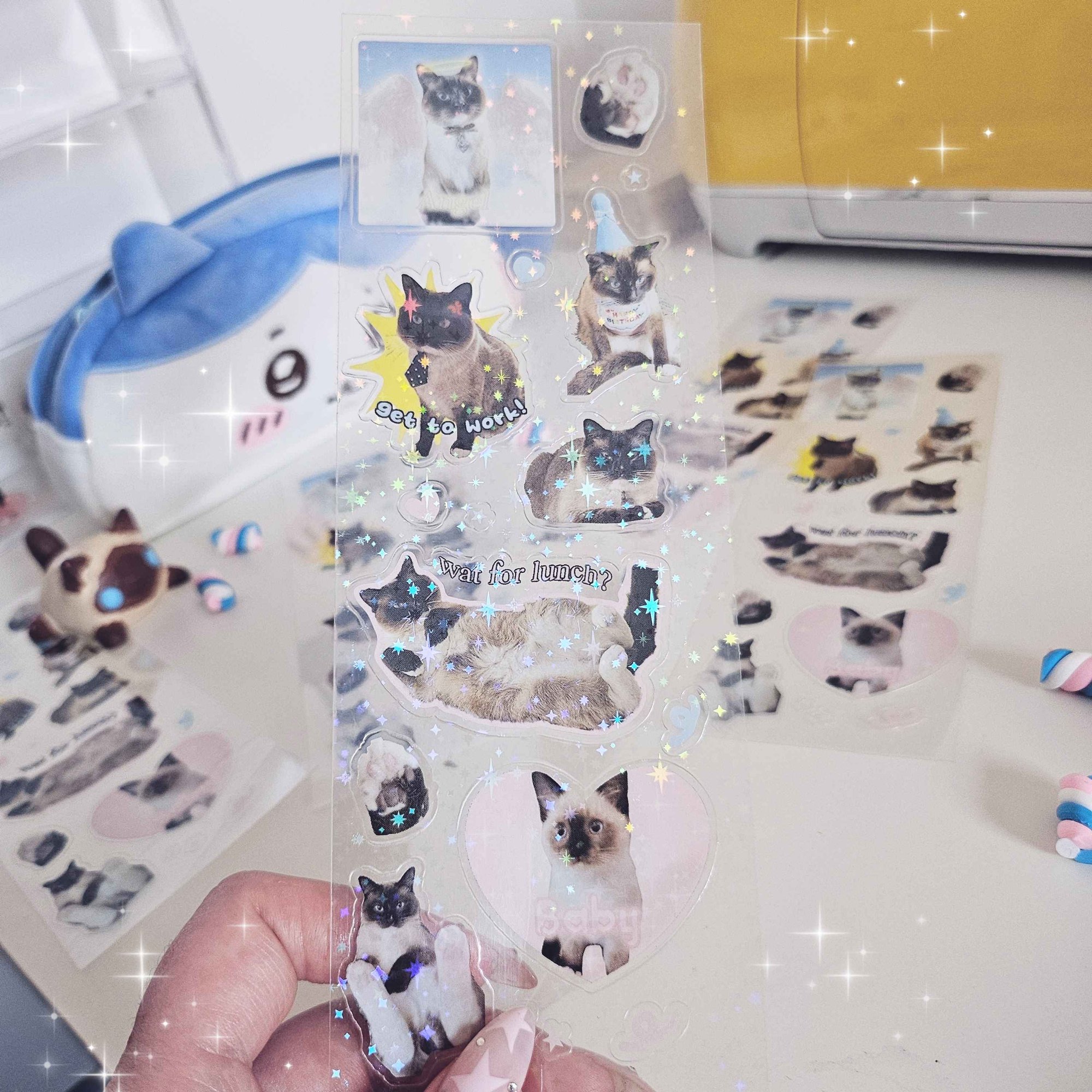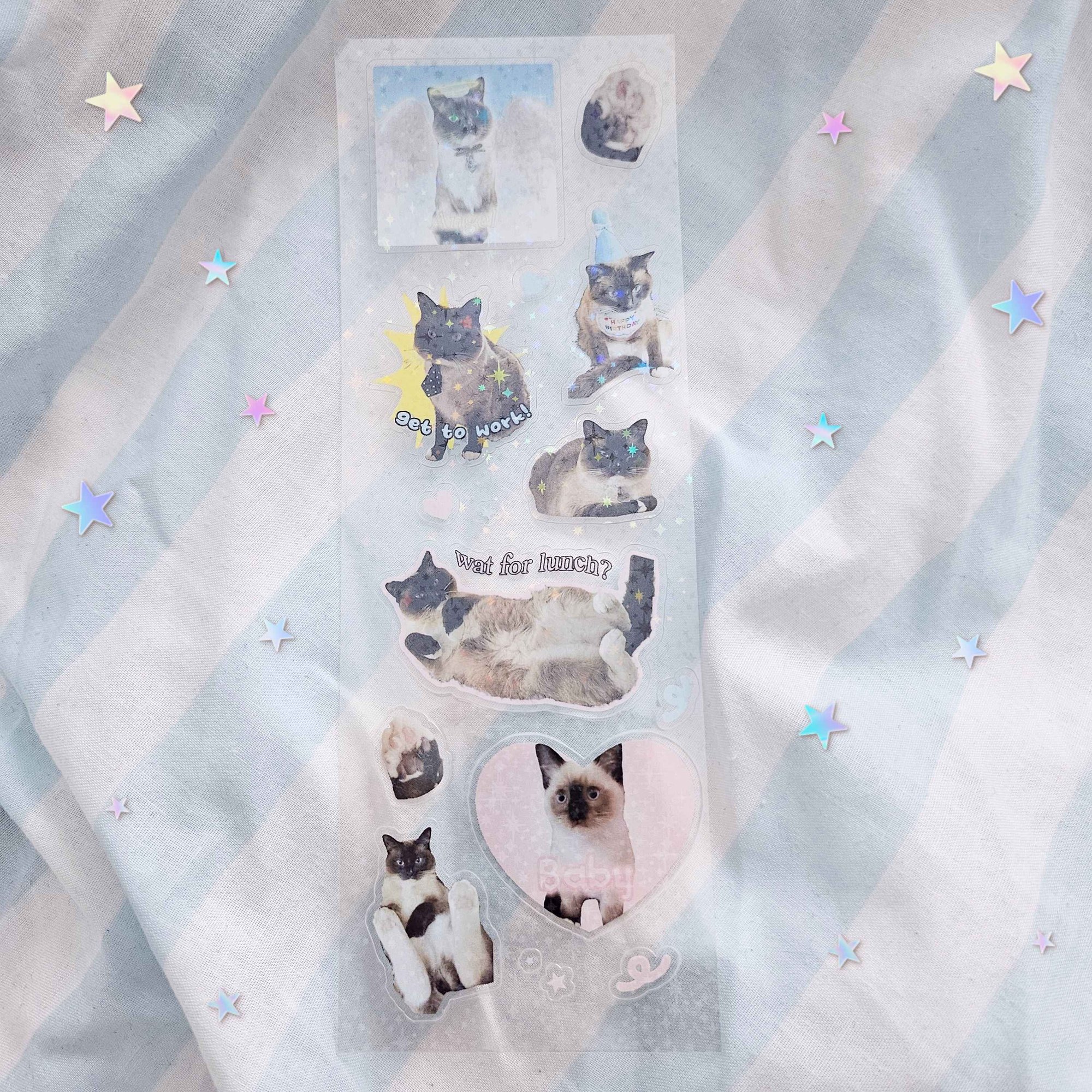 Sticker sheet of my cat Mocha! Clear stickers with a holographic star effect! Comes with a photocard of Mocha.