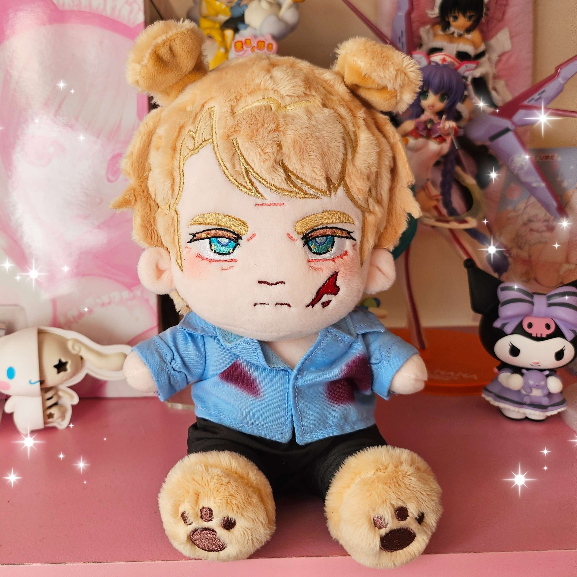 Plushies are approx 18-20cm in height and sit on their own. Clothes are removable. Adam and Lawrence each come with a removable metal cuff and chain on their ankles. Pre-Order bonuses include glitter stickers by guest artists @jirachiki and @turnipoddity.